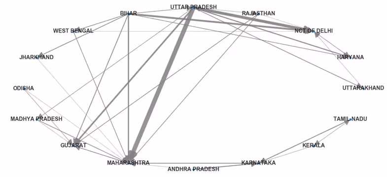 Note: The arrow shows the directionality of migration while the thickness of the edge shows the volume of migration.