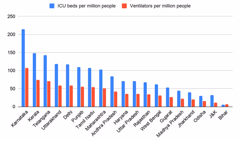 Figure 4. Number of ICU beds and ventilators per million people across the Indian states