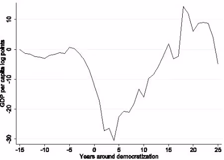 There are several challenges in estimating the impact of democracy on economic growth. First, existing democracy indices are typically subject to considerable measurement error, leading to spurious changes in the democracy score of a country even though its democratic institutions do not truly change. Second, as shown in Figure 1, democratisations are preceded by a temporary fall in GDP. A reliable estimate of the impact of democracy on future GDP therefore needs to model and estimate the dynamics of the GDP process. Finally, even with year and country fixed effects, changes in democracy may be correlated with other changes or respond to current or future economic conditions (Acemoglu et al. 2005 , Brückner and Ciccone 2011), raising obvious omitted variable bias concerns.