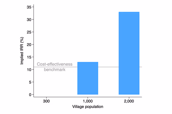 Finally, we use these estimates to quantify the internal rate of return (IRR) from full electrification, net of programme costs (Figure 2). For a 300-person village, our estimates imply a 0% IRR, meaning that even without any time discounting, the 20-year flow of household surplus from electricity consumption would not exceed upfront electrification costs. For a 1,000-person village, we recover a 13% IRR, which barely exceeds the standard 10-12% benchmark commonly used to assess cost-effectiveness of development programmes (Asian Development Bank, 2013). For a 2,000-person village, we recover a 33% IRR, which far exceeds this benchmark and suggests substantial welfare benefits from full electrification.