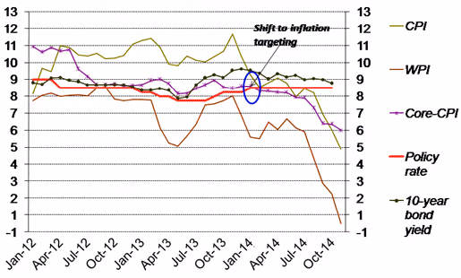 The relevance of the macroeconomic context is observable from the visible balance sheet distress; for example, stressed advances (bad/ restructured loans) increased from 10% to 10.7% of the total advances between March and September 2014; manufacturing grew just 0.7% in April-October 2014 over a -0.1% contraction in the same period last year; bank credit (non-food) growth at 4.3% in March-November 2014 is nearly half of last year; and the cumulative 75 basis points of monetary tightening6 during September 2013-January 2014 all but failed to transmit to banks struggling with tepid loan demand. For manufacturing firms to recover from cyclical and structural shocks of this nature could take very long in an environment of surplus global capacity across countries. If disinflation extracts too high a price in the initial stages of inflation targeting, risks to the next stages of implementation could increase.