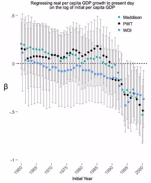 Figure 1 above plots the coefficient (“beta”) from the plain vanilla unconditional convergence regression (relating average growth of real per capita GDP (gross domestic product) over the long run to its initial level). A statistically significant negative beta denotes convergence and divergence otherwise. Since we know from Johnson et al. (2013) that growth rates vary widely across datasets, we plot the annual betas for three such sets: the Penn World Tables (PWT), the World Development Indicators, and the Maddison Project (Bolt et al. 2014).1 While the point estimates vary across datasets, the consistent pattern across them all is a statistically significant negative beta since around 1995 (unconditional convergence) and its lack prior to that (see also Roy, Kessler, and Subramanian 2016).