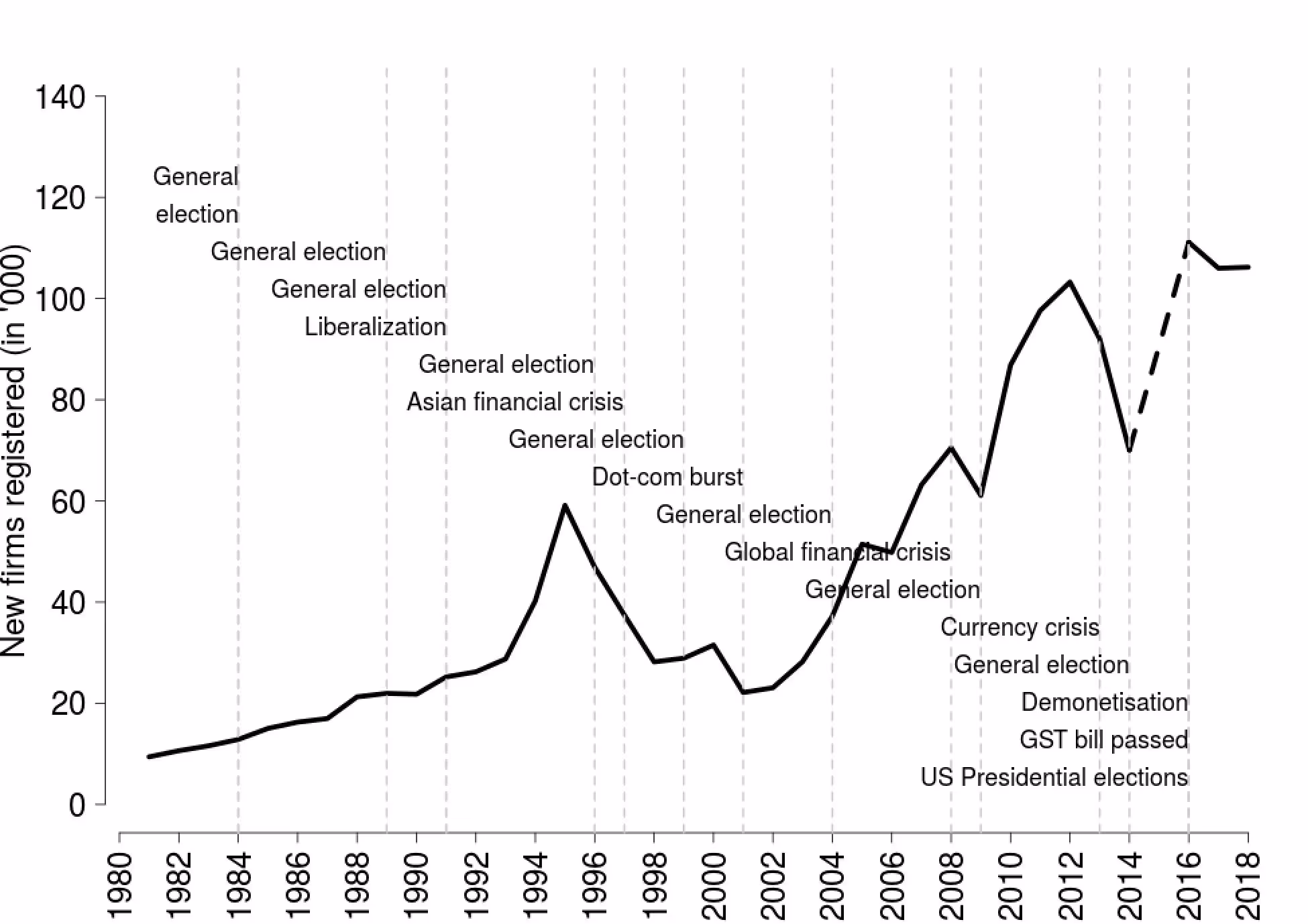 Firm registrations fell in the run-up to the 1996 general elections and continued to fall during the Asian Financial Crisis of 1997 which brought about significant macroeconomic uncertainty in India. Firm registrations picked up only slightly in the run up to the 1999 elections but again dropped at the onset of the dot-com crisis in 2001.