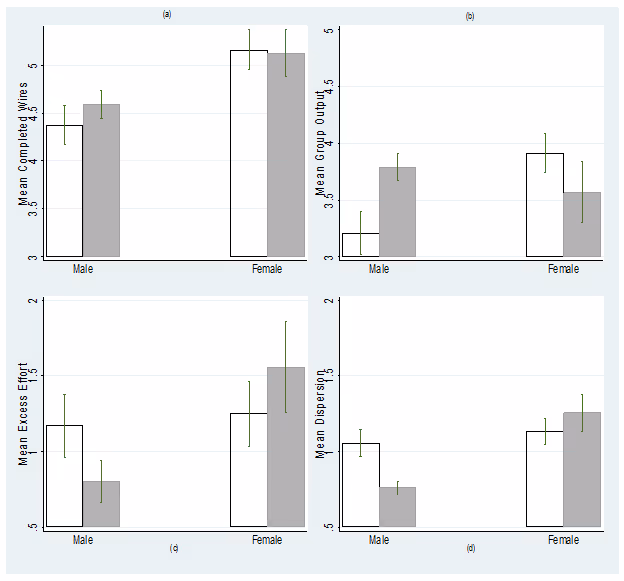 Interestingly, women’s effort is high across both socially connected and unconnected groups relative to men’s, and women show no overall response to being in a socially connected group. Results from additional experiments and data from real-world factory settings to disentangle competing explanations of the observed gender differences suggests a ceiling effect – women’s productivity was high to begin with, resulting in insignificant marginal effect of being socially connected (see Figure 2).