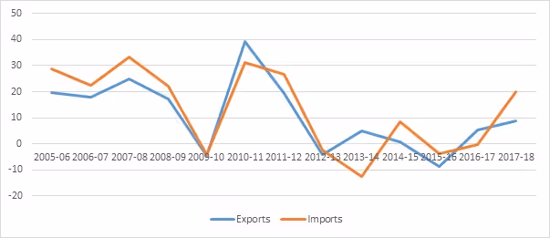 Figure 2. Growth in total trade (non-oil), 2004-05–2017-18 (y-o-y, in %)