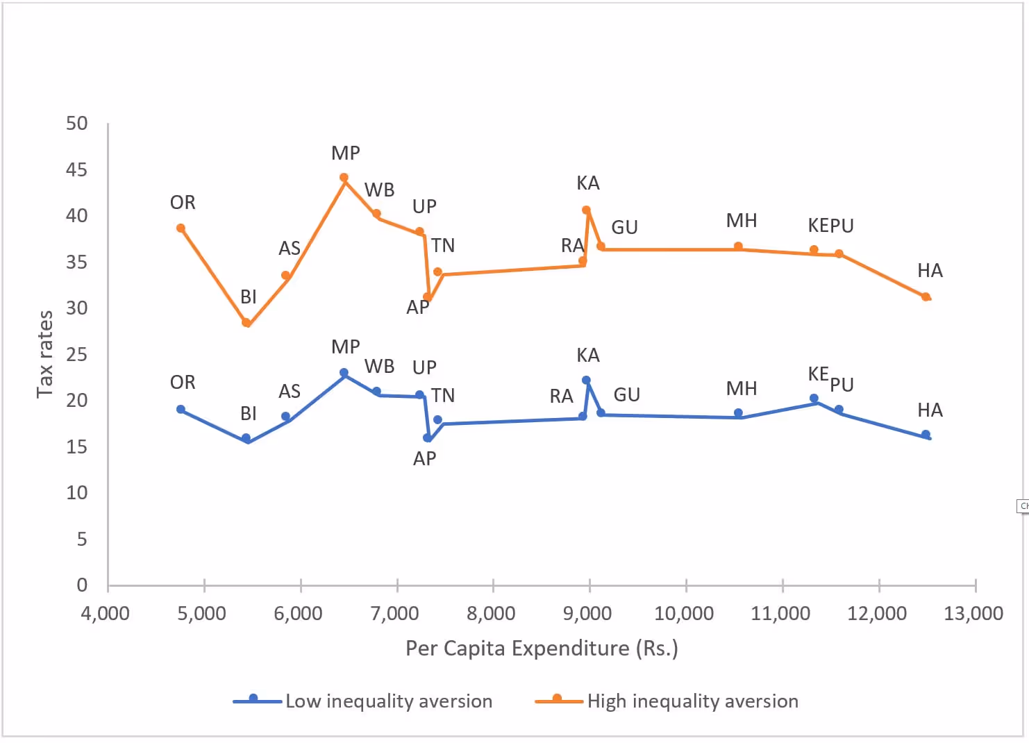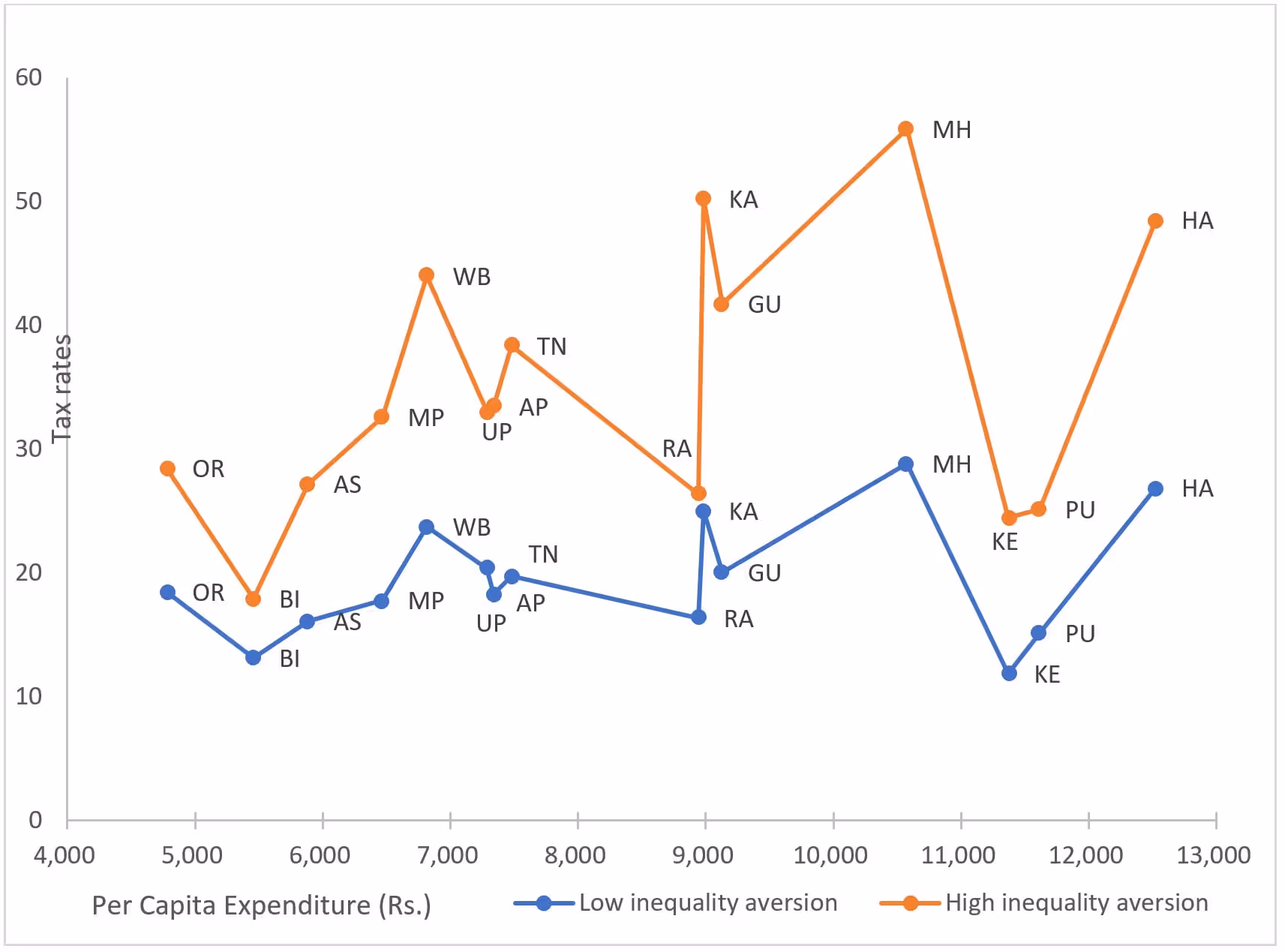 Figure 1 presents the optimal tax rates in each state plotted against the corresponding per capita total consumer expenditure of the states for different items for high and low inequality-aversion. We see that there is considerable spatial heterogeneity in the optimal commodity tax rates. Second, there is a strong negative association between the optimal tax rate of ‘food and beverages’ (necessity) and the state’s affluence as measured by its per capita expenditure, though less so for the other item of necessity, ‘clothing and footwear’. In other words, if states were allowed to levy different tax rates on the same item, provided these are all revenue-neutral, the more affluent states will tend to tax the two items of necessity at lower rates than the less affluent states. In contrast, for ‘housing, water, electricity, gas, and fuels’, this is not the case and there is a positive relationship with optimal tax rates as we move from poorer to richer states. Third, in case of both groups of necessities, namely, ‘food and beverages’ and ‘clothing and footwear’, the blue lines corresponding to the low inequality aversion lie above the orange lines that correspond to the higher level of inequality aversion – signifying lower tax and higher subsidy rates for these items with greater aversion to inequality.