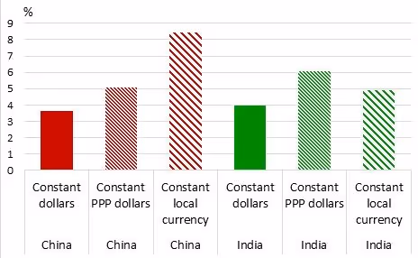 Very few economists and commentators have even entertained the possibility of India doing as well as China. Most comparisons, however, focus on the growth rates of GDP per capita measured in constant local currency. And by this metric, the conclusion that China’s economic performance was superior to India’s seems justified. Indeed, in constant local currency China’s GDP per capita grew on average by 8.4% per year during the first 27 years since the beginning of reforms, while India’s GDP per capita grew by ‘only’ 4.9% per year (Figure 4).