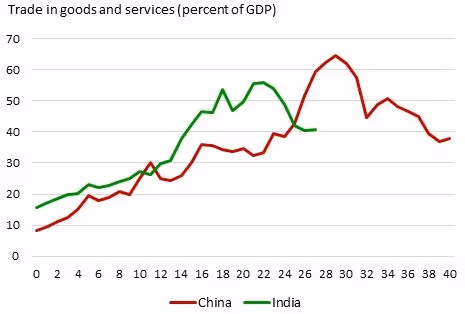 Note: The horizontal axis indicates the time into the reform process, with year 1 being 1978 in China and 1991 in India.