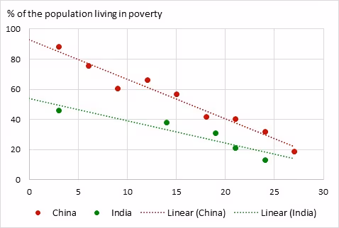 Notes: “Living in poverty” is defined as having daily consumption expenditures below US$1.90 in constant PPP terms at 2011 prices. The horizontal axis indicates the time into the reform process, with year 1 being 1978 in China and 1991 in India.