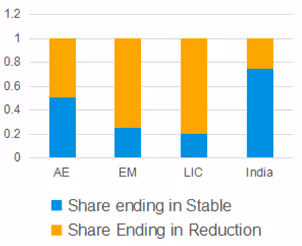 Surges have typically ended in stabilisations in India, whereas in an average EM, 75% of surges end in reductions (Figure 6). In other words, India has been able to sustain debt at high levels without default or restructuring. Across reduction episodes, India reduced debt ratios by 2 pp per year, compared to more than double the figure for the average EM.