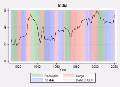 In order to understand where to go from here, we look at India’s own history and also draw on cross-country experiences. Since 1913, India has had nine episodes of debt surges, five episodes of reduction, and six episodes of debt stabilisations.