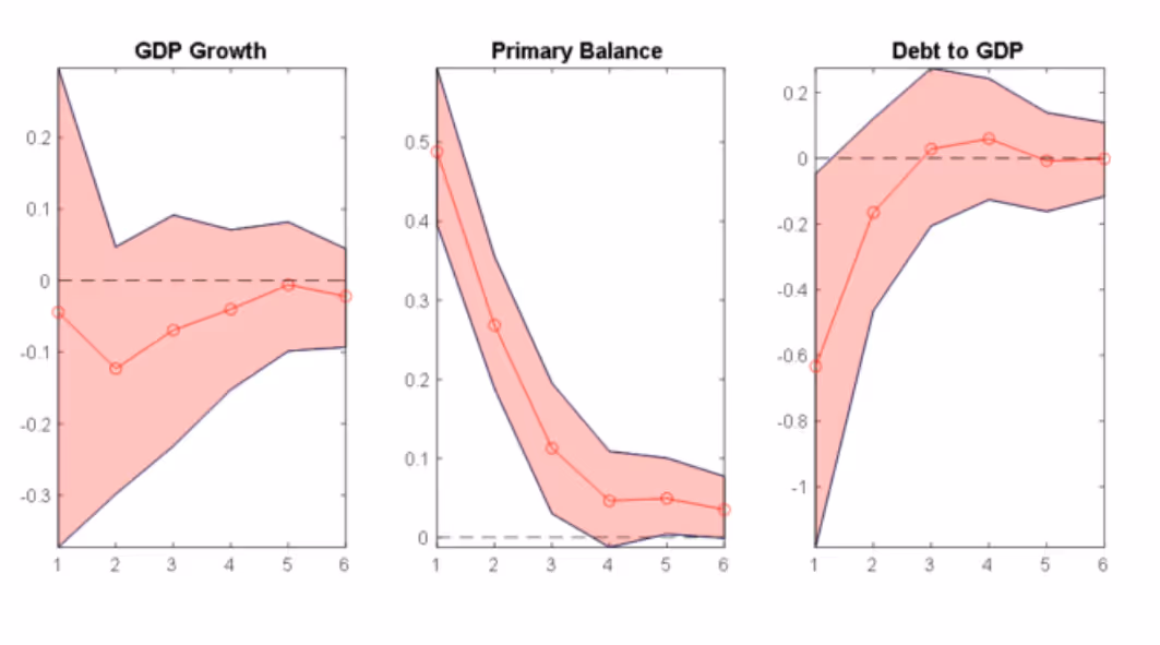 Notes: (i) Impulse response to a primary balance consolidation shock identified in a structural vector autoregression with narrative sign restrictions. (ii) Sample includes 33 emerging economies from 1990-2019. (iii) The model includes five variables: GDP growth, primary balance to GDP, debt to GDP, inflation, and effective interest rate on debt.