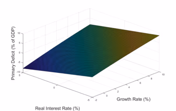 Figure 8a. Primary deficit (% of GDP), growth rate (%), and real interest rate (%)