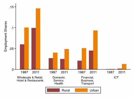 Figure 2 shows how the employment share in these different activities has evolved over time, and varies between rural and urban areas in India. Three patterns are noteworthy. First, employment increased in all service activities. Second, services are particularly concentrated in cities. While this ‘urban bias’ is especially pronounced in producer services like ICT or financial services, it is also apparent in traditional consumer service categories like retail and hospitality. Third, even though India is often hailed as a producer service hub with its call centres and expertise in ICT, consumer services are still the lion’s share of its service sector.