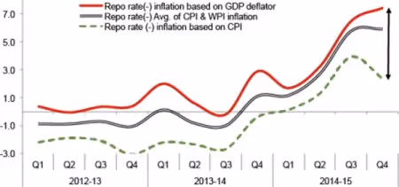 Today, real policy rates are either 2.4% based on the CPI, 5.9% based on the average of the CPI and WPI, or a whopping 7.5% based on the GDP deflator. Which is the right measure of the monetary policy stance?