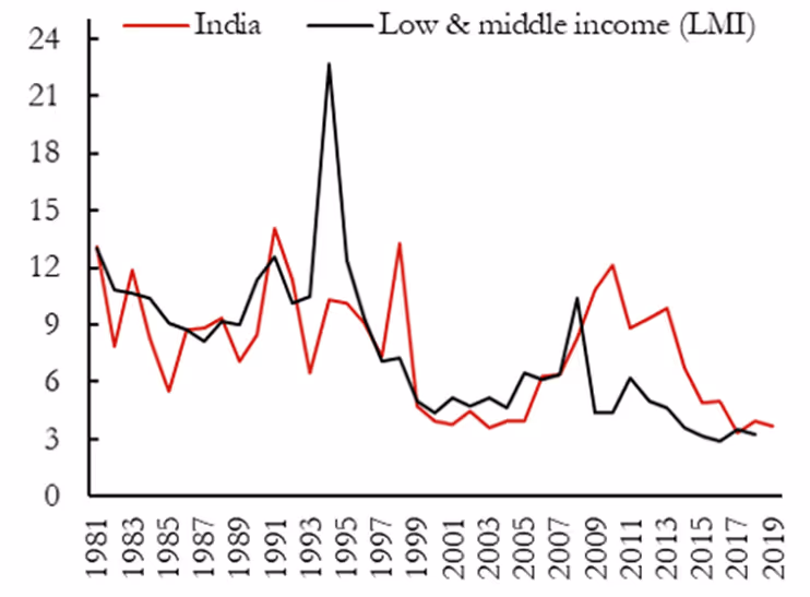 Figure 1b. Long-term inflation rate (consumer prices) in India and its co-movement with low- and middle-income countries