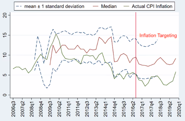 The RBI (Reserve Bank of India) has followed a variety of policy strategies over the years. Following a long period of ‘fiscal dominance’ during which the RBI was expected to monetise budget deficits, the fiscal framework was reformed and strengthened in the early years of the current century, allowing the RBI to exert more independence and bring inflation down to levels characteristic of other low- and middle-income countries. This transition culminated in the inflation-targeting agreement of February 2015 and an amended RBI Act in May 2016,1 which gave the Central Bank a statutory inflation target. At this point the RBI adopted a full IT framework, emulating international best practice.