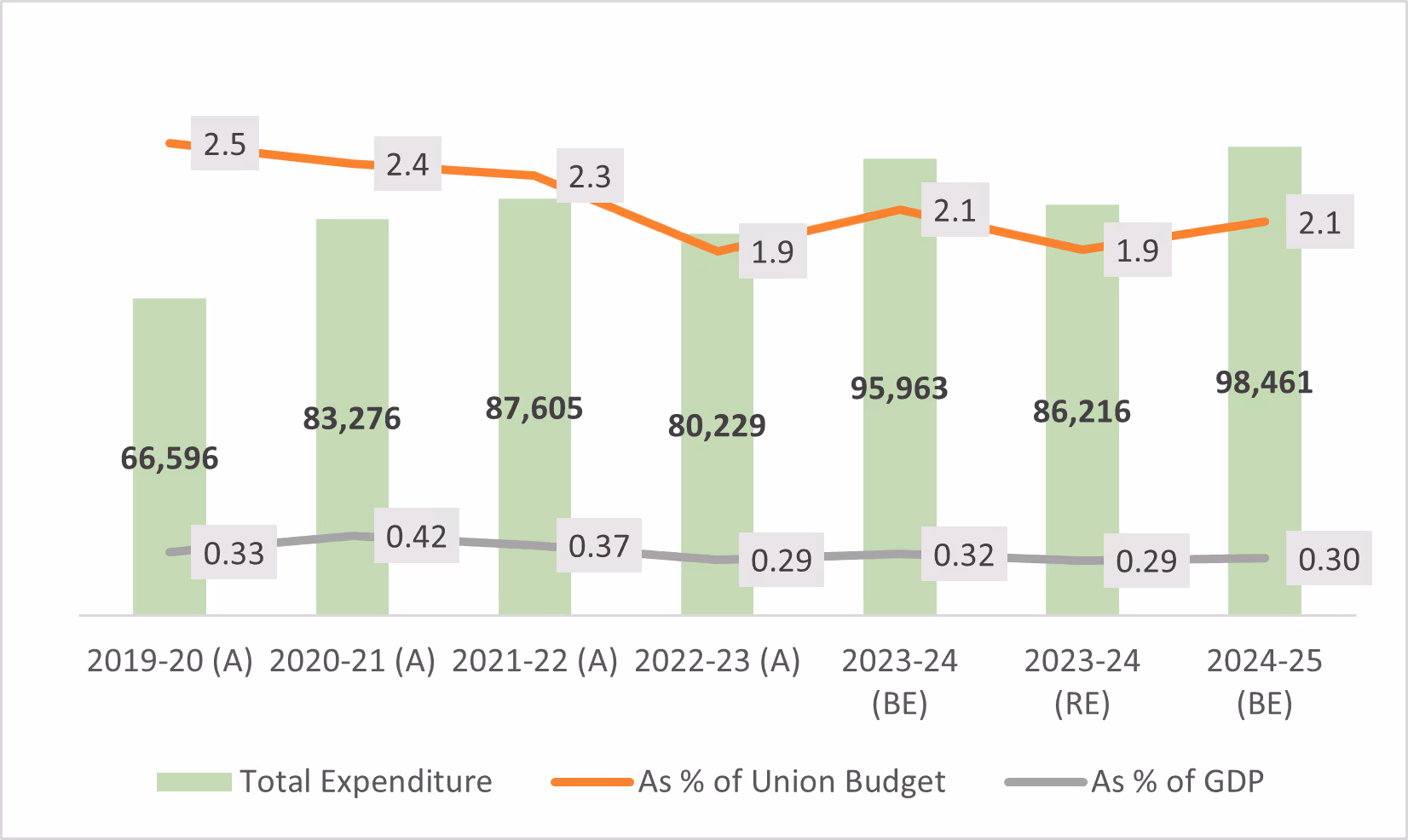 According to the Centre for Budget and Governance Accountability’s (CBGA) analysis of the Union Budget, the overall allocation1 in 2024-25 for the health sector stood at Rs. 98,461 crore, which is a marginal increase of 2.6% from the previous budget estimates (BE) and a 14.2% increase from the revised estimates (RE)2. However, despite the enhanced allocations, the sector’s share in the total Interim Budget and as percentage of GDP has declined over the years (Figure 1). The 143rd Report of the Parliamentary Standing Committee notes that such trends of budgetary allocations do not align with the targets set by the NHP (2017) and highlights the need to assign adequate priority to the health sector.