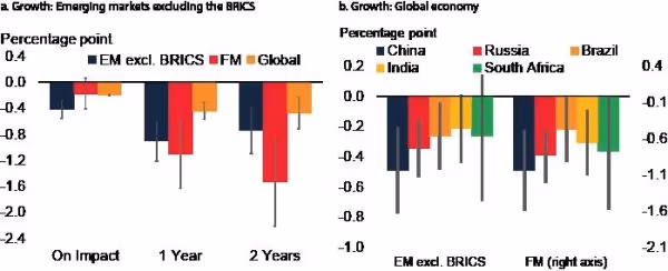 A growth slowdown in the BRICS could reduce global growth, and especially growth in other emerging markets and in frontier markets.We analyse the magnitude of these growth spillovers and find that on an average, a 1 percentage point decline in BRICS growth could, over the following two years, reduce global growth by 0.4 percentage points, growth in other emerging markets by 0.8 percentage points, and growth in frontier markets by 1.5 percentage points (Figure 1a). Sizeable as these are, spillovers from advanced markets are still larger than those from the BRICS, reflecting the dominant role of the former in global trade and finance.