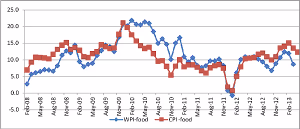Figure 3. Monthly inflation (2008-2013; WPI and CPI-IW)