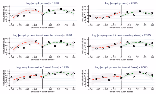 We find a number of results on the effectiveness of RSVY in the short run. First, we find that overall village employment in RSVY districts increased by 11% relative to control districts. This was driven entirely by village employment in microenterprises, with no effect on employment in formal firms. In Figure 2, the left-hand panel shows village-level employment before RSVY (in 1998) and the right-hand panel shows village-level employment after RSVY (in 2005).