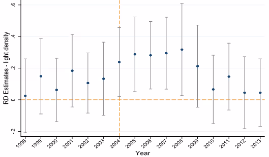 Note: We plot the estimates from the RD regressions for each year separately in this figure.