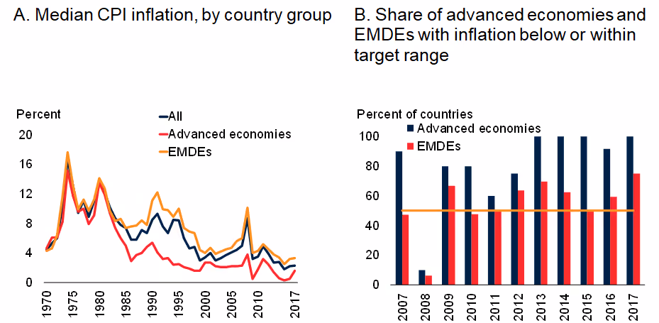 Emerging market and developing economies (EMDEs) have achieved a remarkable decline in inflation since the mid-1970s (Ha, Kose, and Ohnsorge 2019). Median annual national consumer price inflation (CPI) in EMDEs fell from stubbornly persistent double-digits during the 1970s to about 3% in 2018 (Figure 1). By 2017, inflation was within or below central bank target ranges in three-quarters of the EMDEs that had adopted inflation targeting. Inflation has also fallen around the world, from a peak of 17% in 1974 to around 2.5% in 2018. The substantial decline in inflation began in the mid-1980s in advanced economies and in the mid-1990s in EMDEs. By 2000, global inflation had stabilised at historically low levels.