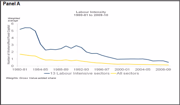 What explains the sustained decrease in labour intensity in the labour intensive-sectors over 30 years in organised Indian manufacturing? There are two standard explanations for the weak performance of labour-intensive sectors in India. The first explanation highlights the stringent nature of labour laws in India. A second explanation highlights a range of supply-side factors, such as infrastructural bottlenecks, poor skills and low literacy rates among unskilled workers in India as possible reasons for firms substituting labour with capital. With respect to the first explanation, several papers have shown that stringent employment protection legislation (for organised sector workers) – among the most protective in the world – has reduced the incentive of firms, especially those in the purview of employment protection legislation, to hire workers on permanent contracts. It has pushed them towards more capital-intensive modes of production, than warranted by existing costs of labour relative to capital. The first explanation may be able to explain the level of labour intensity, and why Indian firms tend to use less labour per unit of capital than firms in other countries at similar level of economic development. However, to explain decreasing labour intensity over time, one would need labour restrictions to become tighter over time. This has not happened, with an absence of pro-worker labour legislations for much of the 1990s and 2000s in most Indian states. On the contrary, Indian firms are increasingly getting around employment protection legislation by using contract workers in place of permanent workers (Saha, Sen and Maiti 2013).