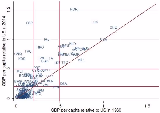 Note: GDP (gross domestic product) per capita is in 2011 PPP (purchasing power parity) dollars. The thresholds for upper-middle income and high income are 20% and 50% of US GDP per capita, respectively (red lines). The diagonal line indicates no change in relative income levels (with respect to the US level).