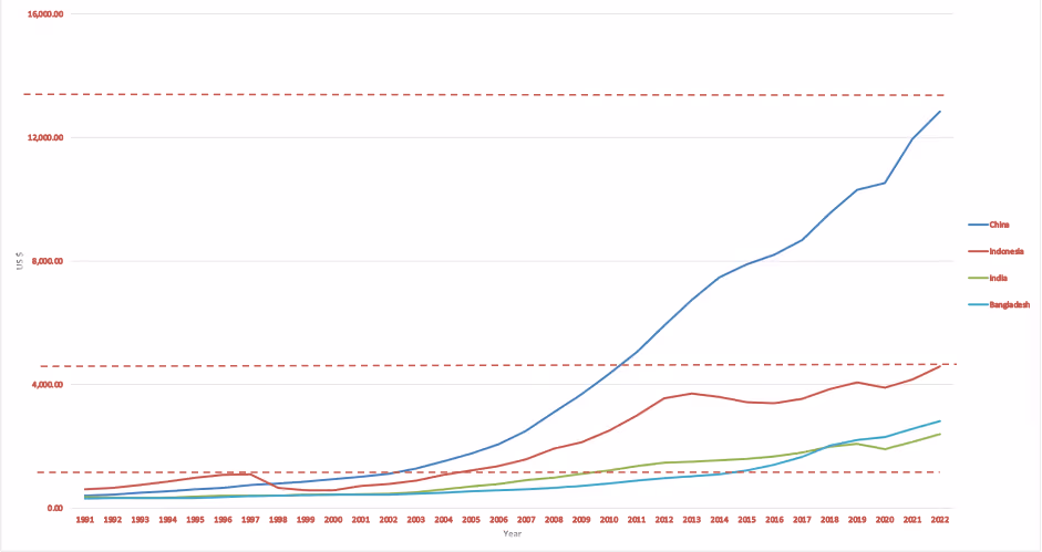Note: The red horizontal lines indicate the World Bank thresholds for classifying countries by per capita income. The thresholds are adjusted for inflation every year, and the thresholds in this graph are based on the current values.
