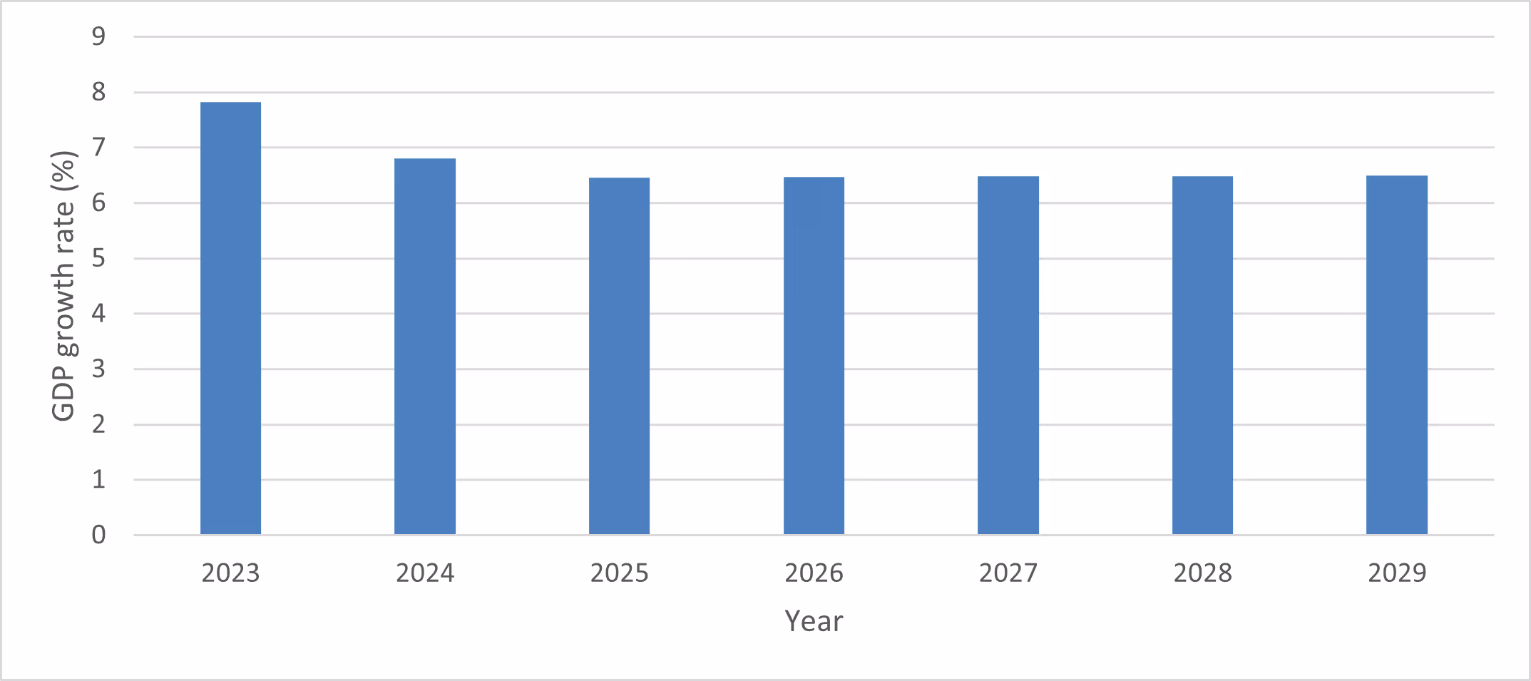 According to the Crisil India Outlook Report (2024), if India’s gross domestic product (GDP) expands by an average of 6.7% during 2025-2031, the country will enter the upper-middle-income category in the next seven years. As per forecasts by the International Monetary Fund (IMF), India can maintain growth rates in the range of 6.4-6.8% over the next five years (Figure 2).