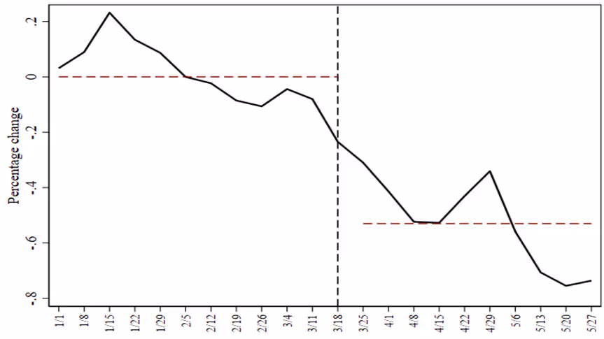 Within a few weeks of the lockdown, we see that the top 50th and 10th percentile of female-dominated occupations experienced a 44% and 77% drop respectively (Figure 3). This large decline persisted for extremely female-dominated (top 10th percentile) occupations. According to our estimates, 67% of the decline in female-dominated occupations is explained by a contraction in industries and locations where women work. We do not find that any of the remaining variation can be explained by the observable job characteristics we have in our sample (wage, education, experience, automation), which suggests that other factors are at play. It is worth highlighting that the fact that women are disproportionately affected by this lockdown is markedly different from other economic downturns (Hoynes 2012).