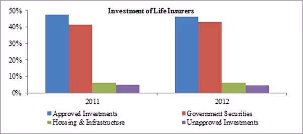 Under the eligible Statutory Liquidity Ratio (SLR) investments, banks are required to hold 24% of their liabilities in gold, cash and government securities. Insurance Regulatory and Development Authority (IRDA) Investment Amendment Regulations, 2001, which covers life insurance, pension and general annuities, unit linked life insurance, general insurance and re-insurance businesses, mandates that life businesses require that at least 65% of assets be held in various types of public sector bonds; non-government investments, if allowed, may not exceed 15% in unapproved assets and approved assets do not include corporate bonds rated below AA. As a result, a major part of investments for life and pension businesses is being held in G-Secs and other approved securities, which are relatively safe instruments (Figure 5). In practice, insurance companies hold less than 7% in unapproved assets.