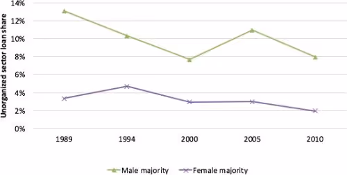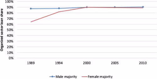 There is also significant disparity against women-owned enterprises in India. Although the gap between the access shares of female employee-dominated plants vis-à-vis male employee-dominated plants is closing in the organised sector, this gap is not shrinking in the unorganised sector. The same is true for female-owned plants in the unorganised sector. Figure 3 makes this point by using the share of males versus female employees split, and plotting the access share to loans for plants with primarily male employees and primarily female employees for the organised (Figure 3a) and the unorganised (Figure 3b) sectors.