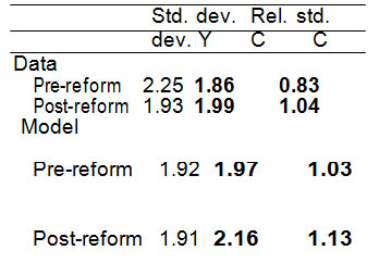 Note: This table presents absolute and relative business cycle volatilities from the simulated model for the pre- and post-reform period. The absolute and relative standard deviation numbers are in percentage (%).
