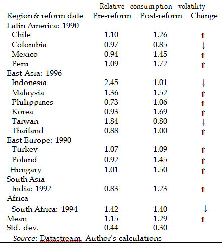 Note: This table shows the reform date and relative consumption volatility in the pre- and post-reform period for a set of emerging economies. Here, the volatility of a variable is defined as the standard deviation of the cyclical component of the variable. The choice of the date on which reform took place is based on Kim et al. (2003), Singh et al. (2005), Rodrik (2008), Alp et al. (2012) and Aslund (2012).