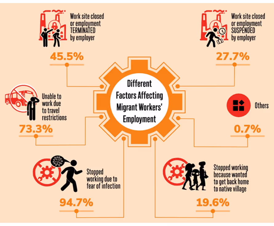 There were multiple, overlapping factors that contributed to the disruption of the employment of migrant workers. About 70% of them reported being impacted by worksite closure, or employment being terminated or suspended by the employer. Nearly three-quarters also reported being unable to work due to travel restrictions. Nearly all (more than 94%) surveyed migrant workers report fear of infection as a factor contributing to them stopping work (Figure 1).
