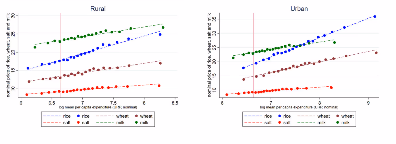 Notes: i) The upward slopes here capture the higher nominal prices paid by households for the same good at different per capita expenditures. These are arguably induced by differences in the quality of staples purchased at different expenditure levels when compared to the slope of salt. ii) Unit prices are calculated as the ratio of household expenditure on items and quantities consumed in the 2011 round of CES. iii) The unit price for rice and wheat depicted in the figure does not include households’ cereal consumption from the Public Distribution System (PDS). iv) The vertical red line is the $1.90 poverty line – poor households are to the left of this line