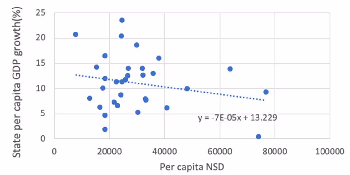 Notes: (i) The figure depicts state income growth between 2004 and 2015 against 2004 level of income. (ii) NSD refers to net state domestic product.