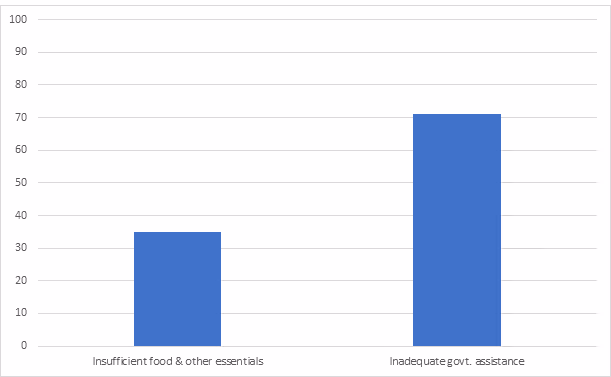 Forty seven percent of the respondents report receiving some kind of assistance or help during the lockdown – 89% of the respondents received assistance from the government, 12% received assistance from friends and relatives, and 4% received assistance from other sources such as the local political leader, NGO, etc. Majority of the assistance from the government was in the form of financial assistance and provision of food and other groceries. A few individuals specifically mentioned getting cooked food from the government. However, 71% of the respondents thought the help from the government during the lockdown was inadequate.
