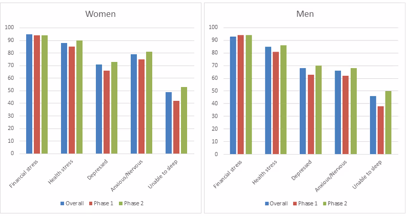 इस अवधि में और चरणों के दौरान वित्तीय चिंताएं पुरुषों और महिलाओं दोनों के लिए तनाव का सबसे बड़ा कारण बनी हुई हैं। हम पाते हैं कि पुरुषों और महिलाओं दोनों के लिए पहले चरण की तुलना में दूसरे चरण में स्वास्थ्य संबंधी चिंताओं, अवसाद और व्यग्रता, तथा नींद में गड़बड़ी में वृद्धि हुई है। पुरुषों की तुलना में महिलाओं में अधिक तनाव प्रदर्शित होना जारी रहा है।