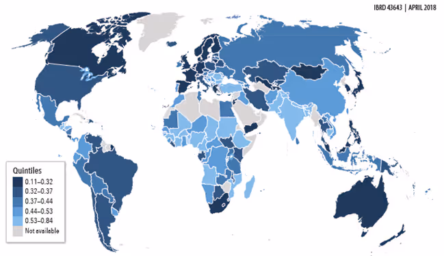 In other words, lower intergenerational mobility (or higher inequality of opportunity) tends to be concentrated in the lagging areas of the US, which constrains the prospects for convergence. What would a global map of mobility look like? If the geographic patterns observed in the US are also observed across countries, then the least mobile countries are more likely to be found in the developing world. If there is indeed a gap in the equality of opportunity between the developing and the developed world, has that gap been closing over time?