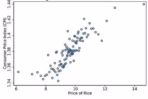 As a result, many economists have called for the PDS to be converted into a cash transfer programme. However, we show theoretically that in-kind transfers (the option to buy an allocation of rice at a fixed price) can be superior when households face price risk. Intuitively, this is because a cash transfer is always worth the same amount, but an in-kind transfer is worth more as prices increase. The more highly correlated the price of the transferred good is with overall prices, the better the system works, because it means that the transfer is larger when prices are high. Figure 3 shows that prices are highly correlated; the prices faced by the average household increase by almost 2% for each 10% increase in the rice price. In concrete terms, when overall prices increase, the increase in the value of the rice transfer makes up 10.8% of the increased cost for PDS-consuming households.