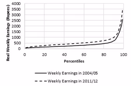 The decrease in inequality is also reflected in the Gini coefficients2. The Gini coefficient of real weekly earnings fell from 0.462 to 0.396. This is in sharp contrast to the picture in urban India where earnings inequality remained virtually unchanged over the period: The Gini coefficient of real weekly earnings in urban India was 0.506 in 2004-05 and 0.499 in 2011-12.