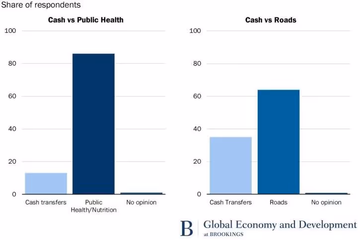 Of the approximately 3,800 respondents, only 13% chose cash if it came at the expense of spending to improve public health and nutrition (preferred by 86% of respondents). In contrast, if the cash came at the expense of improving roads throughout the block, the number rises to 35% of respondents choosing cash. These percentages are the same when we restrict the sample to respondents with little or no education, or to those who belong to historically disadvantaged caste groups. That is, the poor and less educated are overwhelmingly choosing public health over cash.