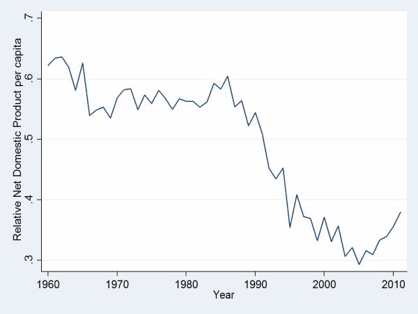Figure 1. Net Domestic Product (NDP) per person: Bihar relative to India (1960-2011)