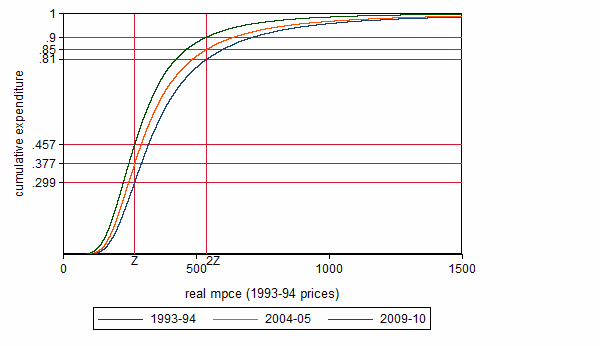 Figure 1 below shows growth over the last 20 years has moved the entire distribution to the right. In other words, all income groups have experienced some increase in their consumption. In fact, the population below the poverty line1 has come down from around 45% to 30%. This seems to suggest that we have made reasonable progress on the poverty front. However, in the context of the fast per capita GDP growth that India has had, its poverty performance leaves a great deal to be desired.