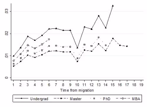 The former is the case for work migrants in our sample. The longer they stay in the US, the less likely they are to return to India. On the contrary, education migrants, while less likely to return overall, exhibit a time-increasing risk of return. In Figure 1, where we report the estimated hazard ratios for migrants who left India in the 1990s, we can see how the risk of return doubles over the first three years for both master’s and the doctoral graduates, then becomes quite stable, plunges after 10 years, and picks up again later on. Patterns for migrants of the 2000s cohort are similar.