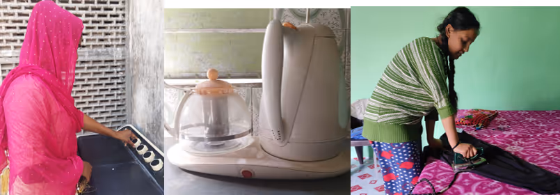 राजस्थान और उत्तराखंड में सेवा अनुबंध की उद्यमी सखी - अंजलि बेन और निशा बेन की प्रविष्टियां — जिसमें वॉशिंग मशीन (बाएं), इलेक्ट्रिक केतली (बीच में) और आयरन बॉक्स (दाएं) शामिल हैं)।