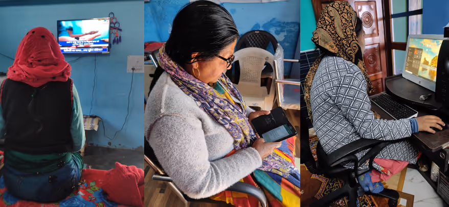 दिल्ली में सेवा सर्वेक्षण के साथ जमीनी स्तर की डिजिटल डेटा संग्रहकर्ता - काजल बेन और नैना बेन की प्रविष्टियाँ, जो काम के लिए कंप्यूटर का उपयोग (बाएं), और ई-श्रम कार्ड बनाने और यात्रा के दौरान संगीत सुनने के लिए स्मार्टफोन का उपयोग (केंद्र और दाएं) करते हुए दर्शाते हैं।